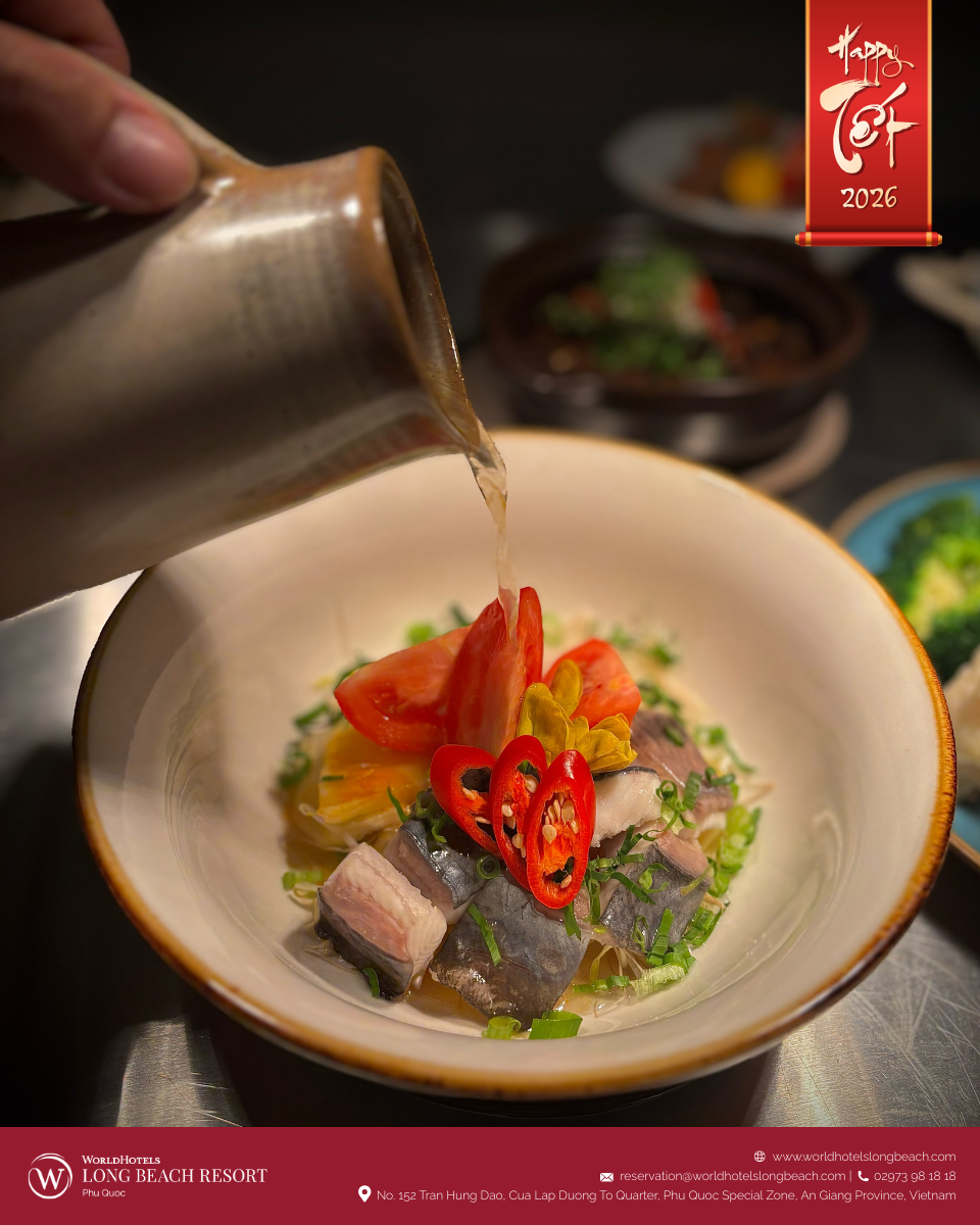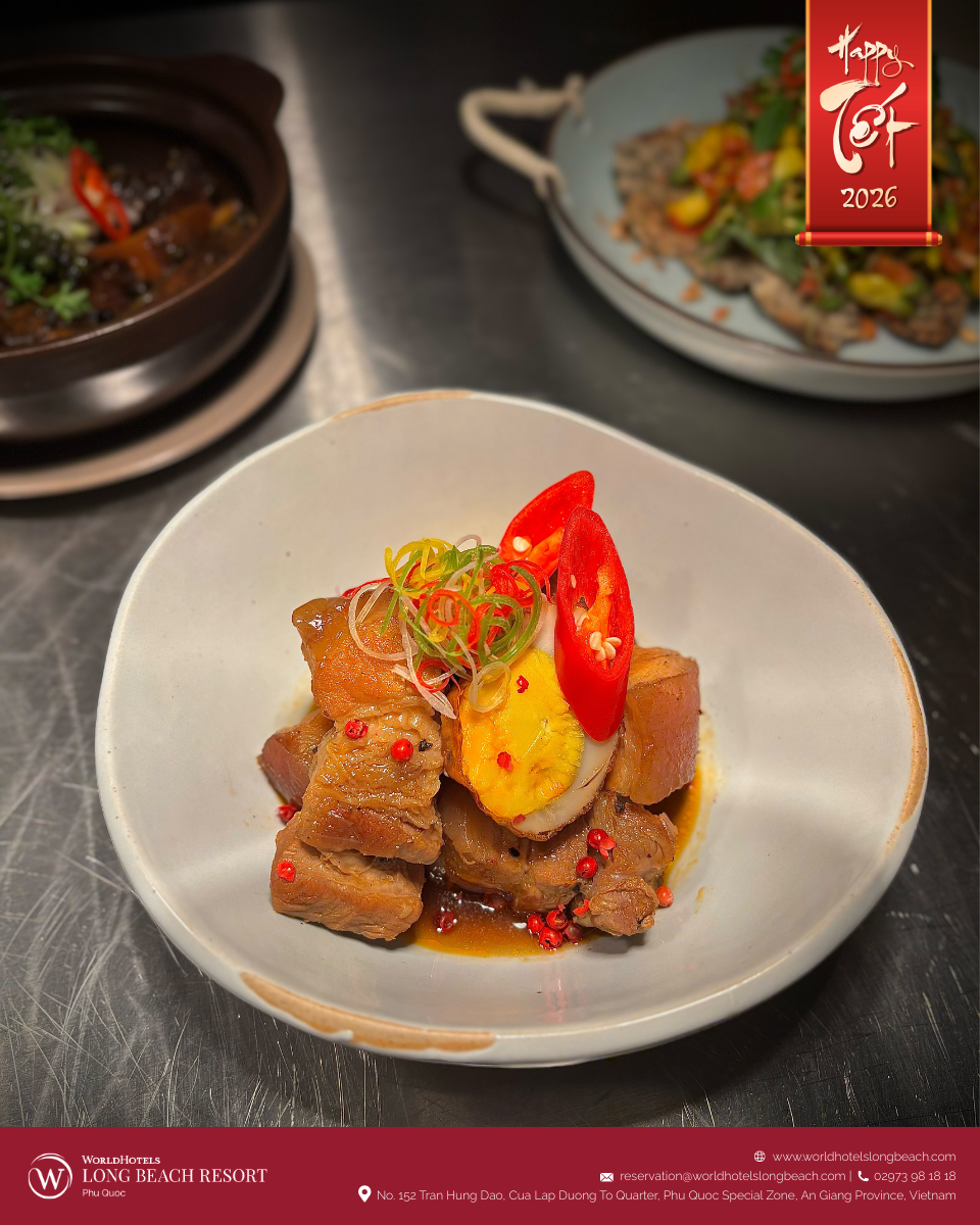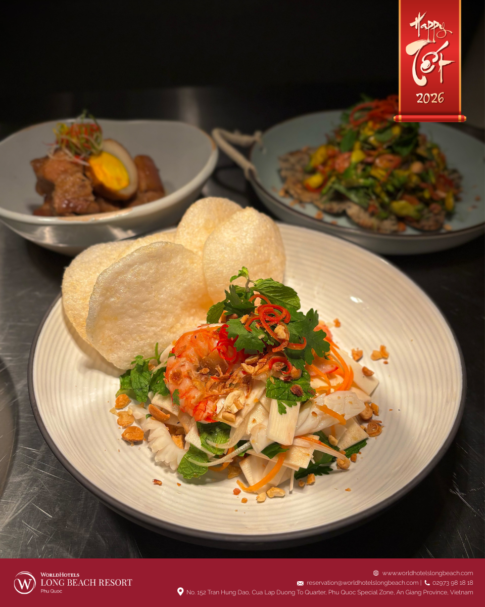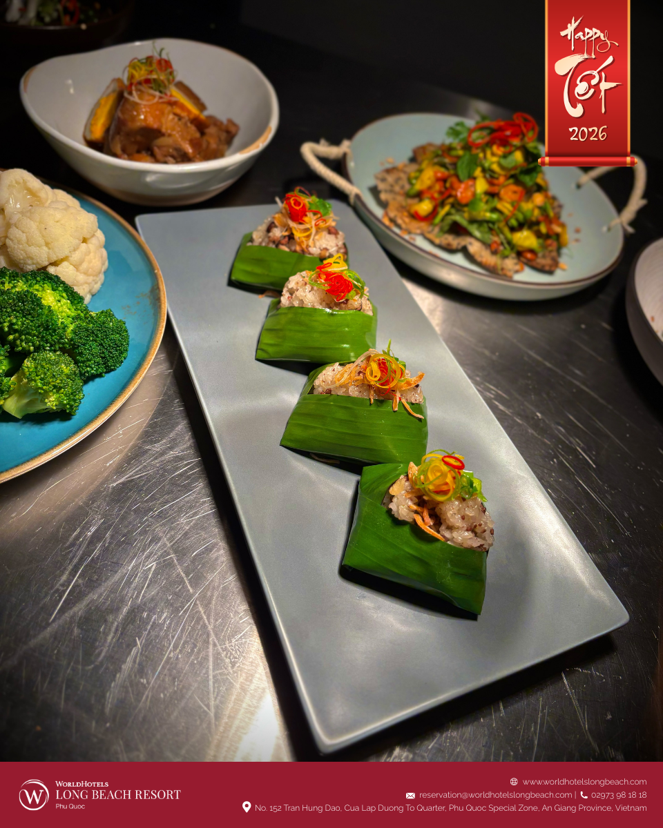 Ẩm thực luôn là phần không thể thiếu, và tại WorldHotels Long Beach Resort Phú Quốc, trải nghiệm ấy được nâng tầm thành một câu chuyện vị giác trọn vẹn. Không gian nhà hàng được phủ sắc xuân và giới thiệu thực đơn đặc biệt mang chủ đề “Tết on the Table”, nơi tinh thần Tết truyền thống Việt Nam được tái hiện qua những sáng tạo ẩm thực tinh tế dưới bàn tay đội ngũ đầu bếp.