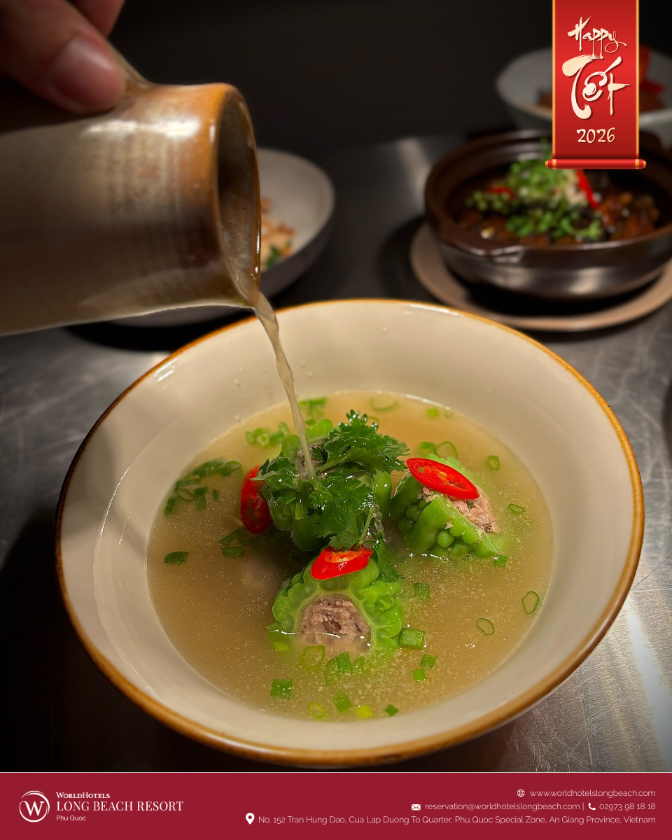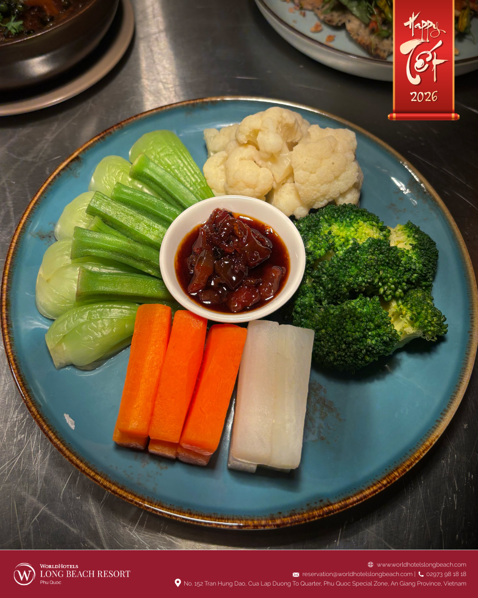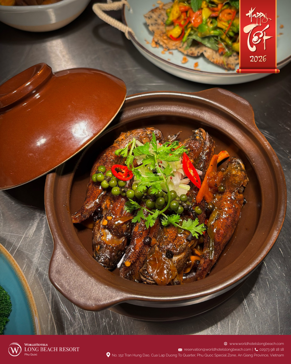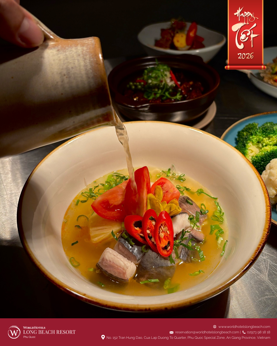 Ẩm thực luôn là phần không thể thiếu, và tại WorldHotels Long Beach Resort Phú Quốc, trải nghiệm ấy được nâng tầm thành một câu chuyện vị giác trọn vẹn. Không gian nhà hàng được phủ sắc xuân và giới thiệu thực đơn đặc biệt mang chủ đề “Tết on the Table”, nơi tinh thần Tết truyền thống Việt Nam được tái hiện qua những sáng tạo ẩm thực tinh tế dưới bàn tay đội ngũ đầu bếp.